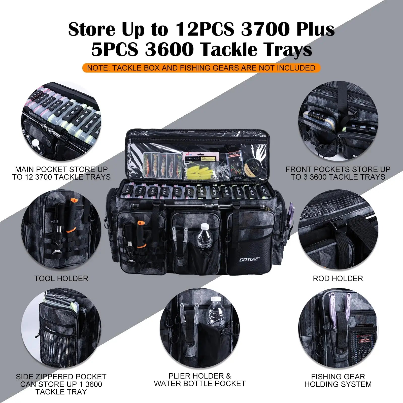 With room for 8 X 3700-size and 6 X 3600-size tackle box trays (NOT INCLUDED, SOLD SEPERATELY), The fishing gear bags keep your gear organized. Featuring a rod holder strap and multiple D-buckle strips, it's designed for easy tool and accessory transport