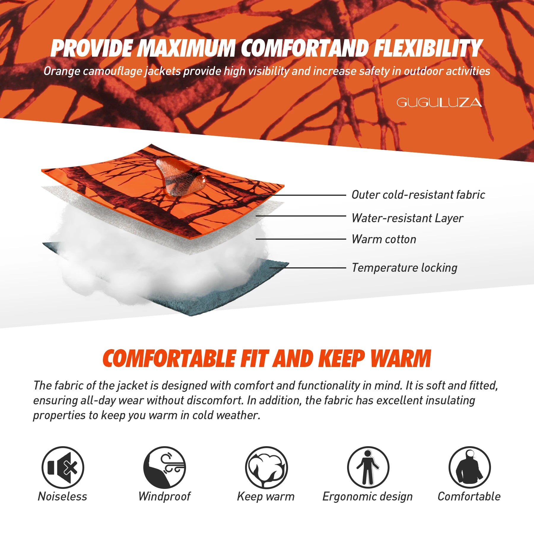 The camouflage outer fabric is windproof, the fleece lining blocks cold air, and the lining is breathable; the three-layer fabric helps keep your body warm and comfortable.