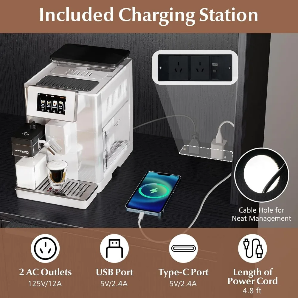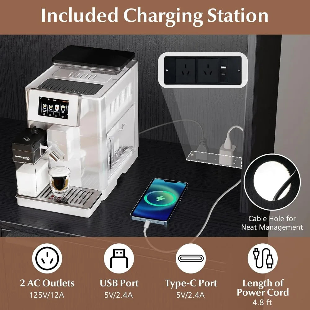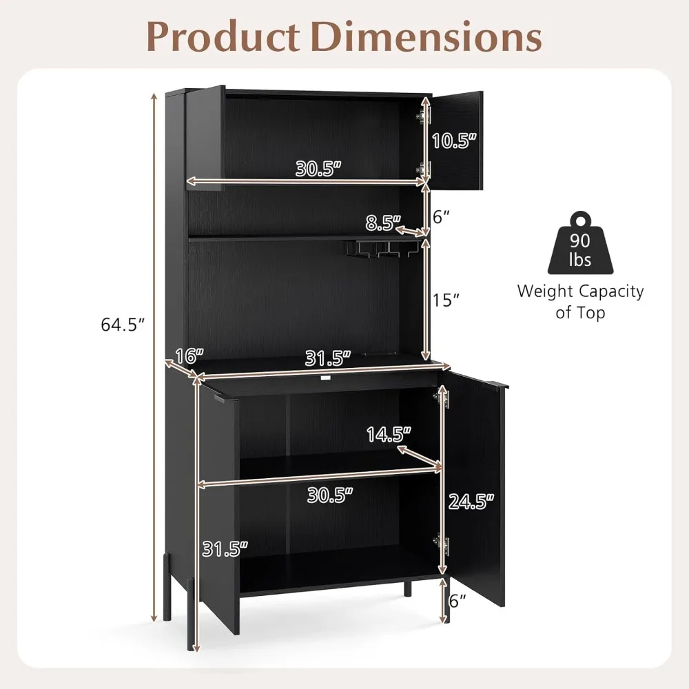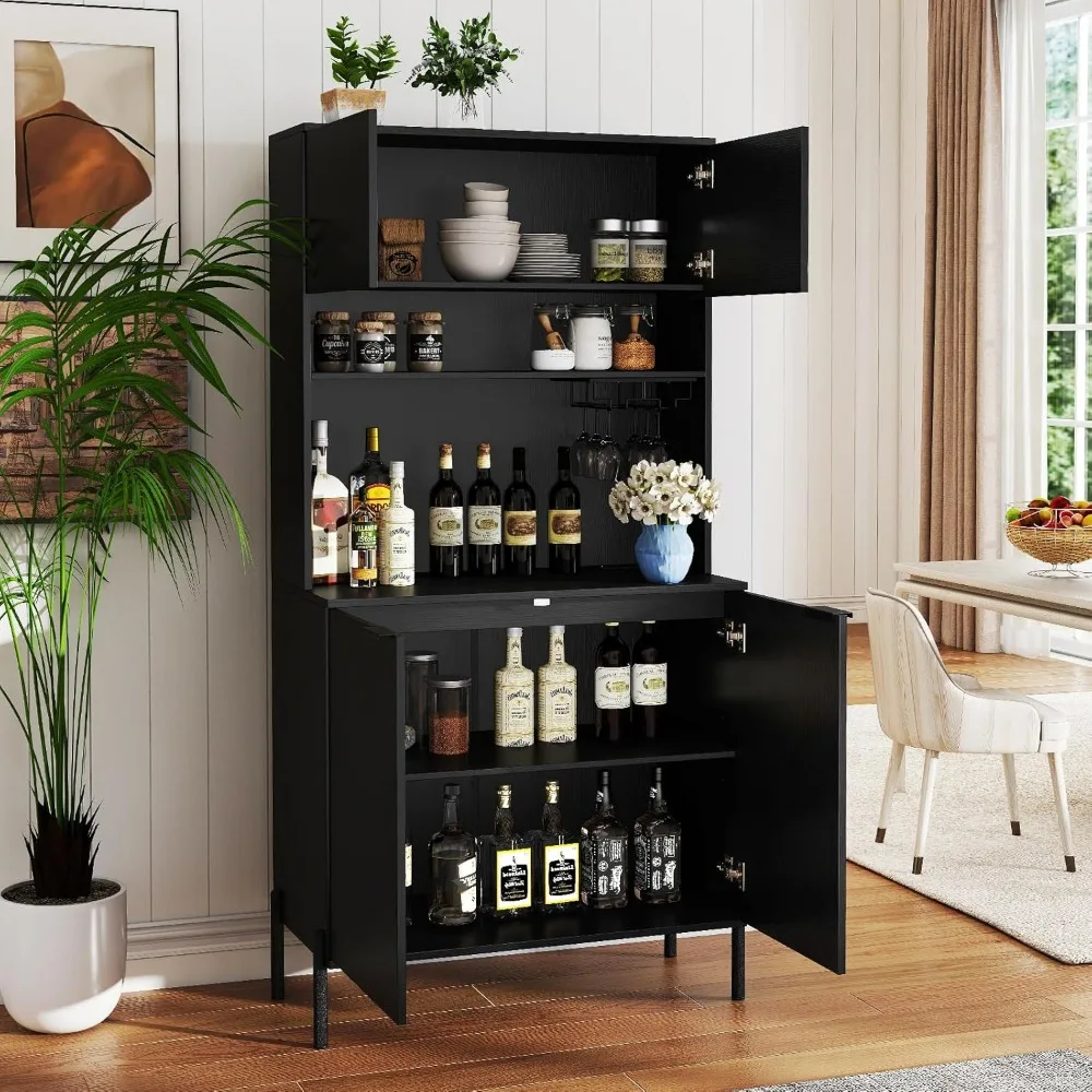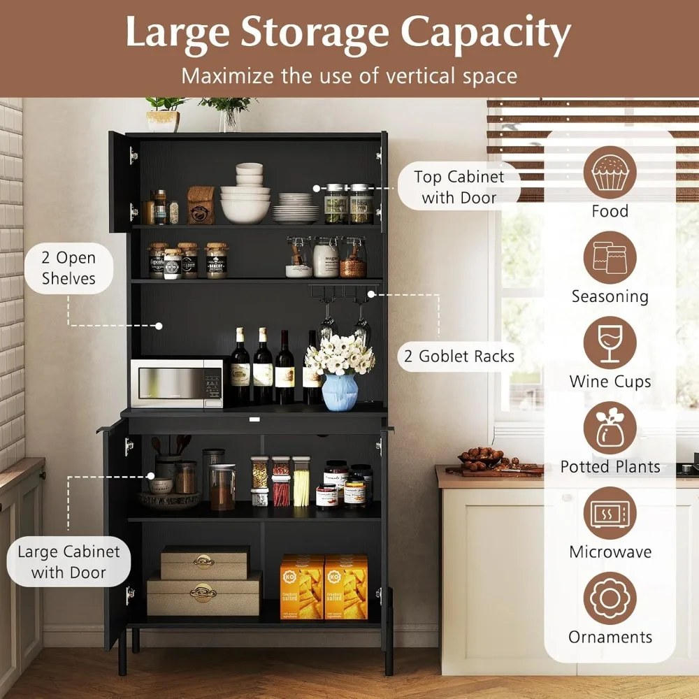 This kitchen pantry cabinet offers a large storage capacity with two cabinets featuring doors for ample storage, two open shelves for easy access to frequently used items, and two goblet racks for your glassware, making the most of vertical space. It includes a built-in charging station with two AC outlets, a USB port, and a Type-C port, allowing you to charge multiple devices like a microwave or coffee maker simultaneously. There's also a cable hole for tidy wire management. The lower cabinet has an adjustable shelf with three height settings, each increasing by 2.5 inches, providing flexibility to customize your storage space as needed. Designed with safety in mind, this kitchen storage cabinet features an anti-tipping device and sturdy supporting legs for reliable stability. It's versatile for use in various settings, perfect for storing food, seasonings, wine glasses, potted plants, microwaves, and decorative items. The cabinet's sleek, modern design complements a range of indoor environments.