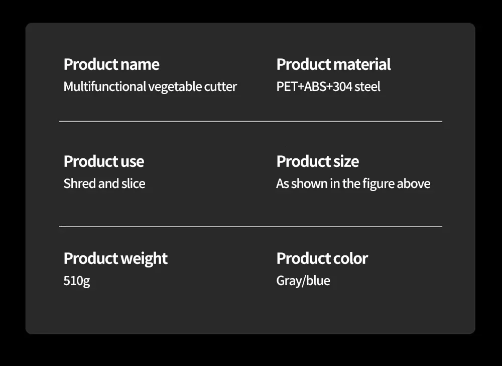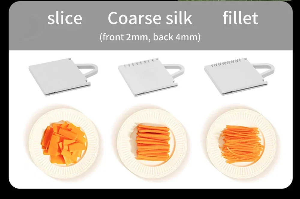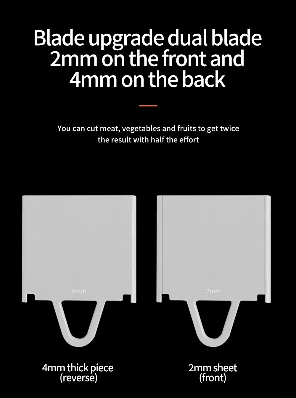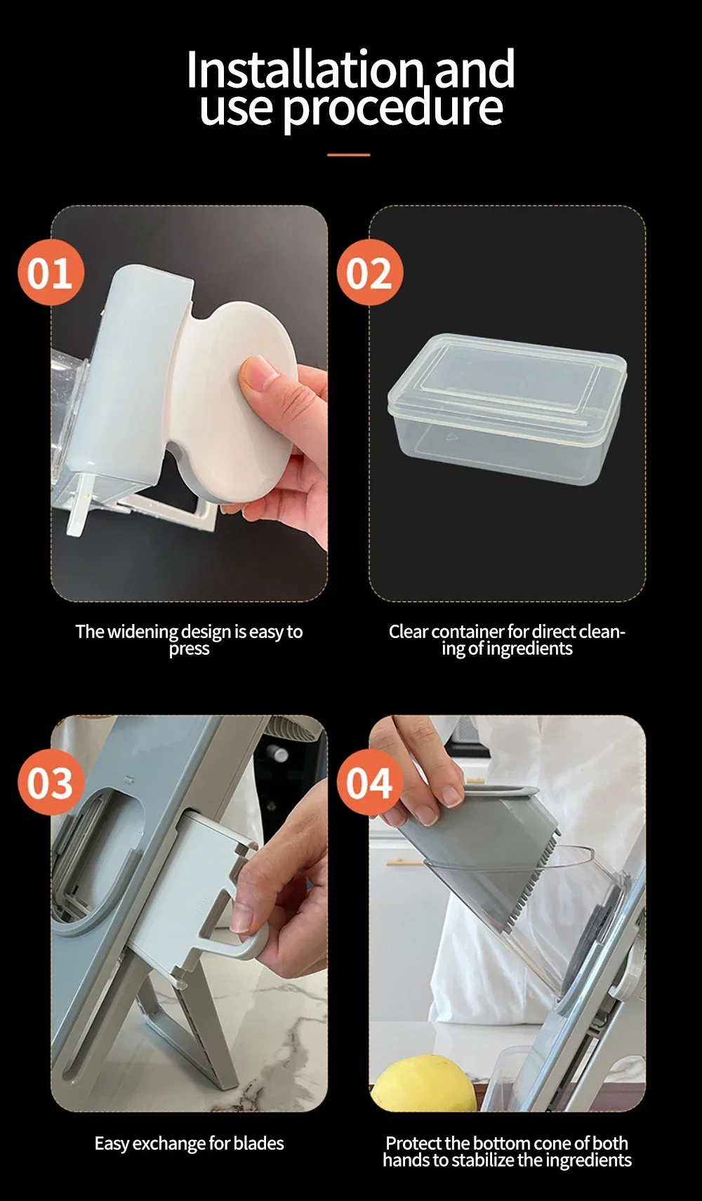 1.This hand-held slicer made from Food-Grade stainless steel & BPA-Free ABS plastic offers.It offers all the functionality of multiple appliances with changeable stainless blades. These blades can cut through all kinds of vegetable, grating cheese, slicing potato and cutting fruits, even can create paste-like vegetables or mashed potatoes .